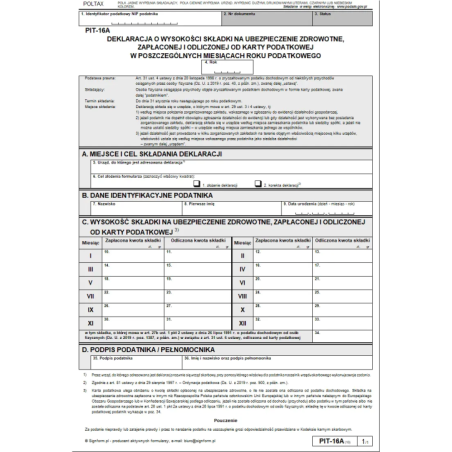 PIT-16A (wersja 10)Deklaracja o wysokości składki na ubezpieczenie zdrowotne, zapłaconej i odliczonej od karty podatkowej w poszczególnych miesiącach roku podatkowego