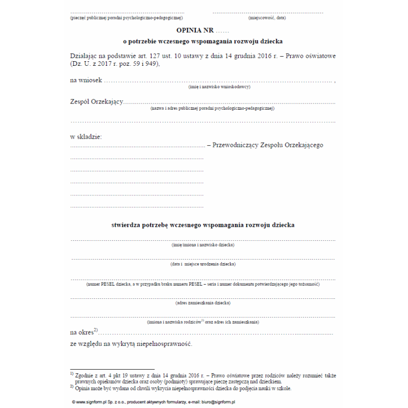 Opinia o potrzebie wczesnego wspomagania rozwoju dziecka