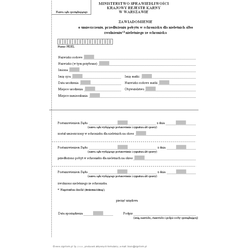Zawiadomienie o umieszczeniu, przedłużeniu pobytu w schronisku dla nieletnich albo zwolnieniu nieletniego ze schroniska