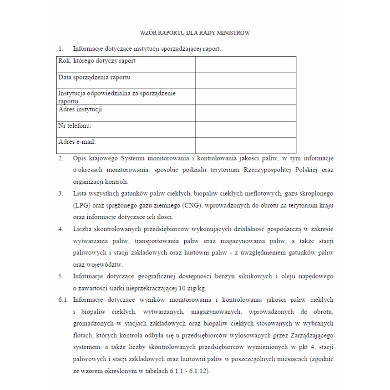 Wzór raportu dla Rady Ministrów z krajowego Systemu monitorowania i kontrolowania jakości paliw