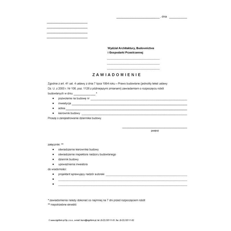 Zawiadomienie o rozpoczęciu robót budowlanych (do Wydziału Architektury, Budownictwa i Gospodarki Przestrzennej)